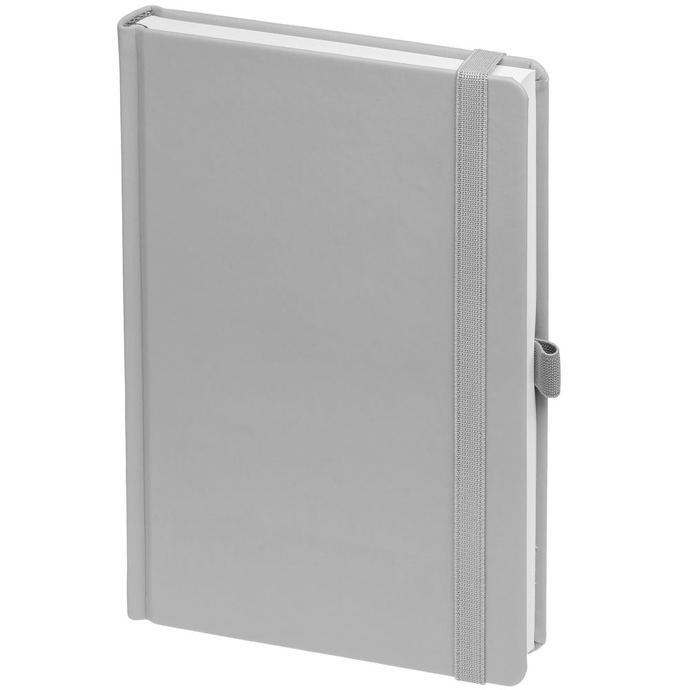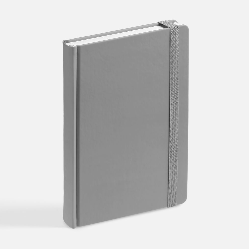 Ежедневник с твердой обложкой без поролона, выполнен из материала Soft Touch, серый СС, дополнен резинкой шириной 1 см, петлей-резинкой для ручки, капталом и ляссе серого цвета.
