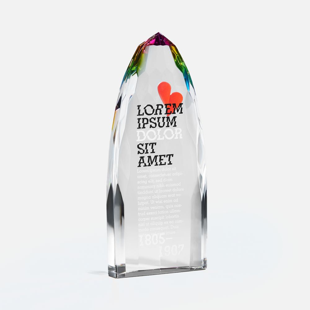 Объемная высокая стела Gleampeak олицетворяет стремление к победам и блестящий успех, свет от которого будет еще долго разливаться вокруг. Необычная форма с легкой огранкой и плавно скошенными краями усиливает визуальный эффект и создает притягательные отблески по всей стеле — она словно светится изнутри! Такое разноцветное свечение — яркий символ творческого подхода, который окрасит в разные оттенки любое дело.