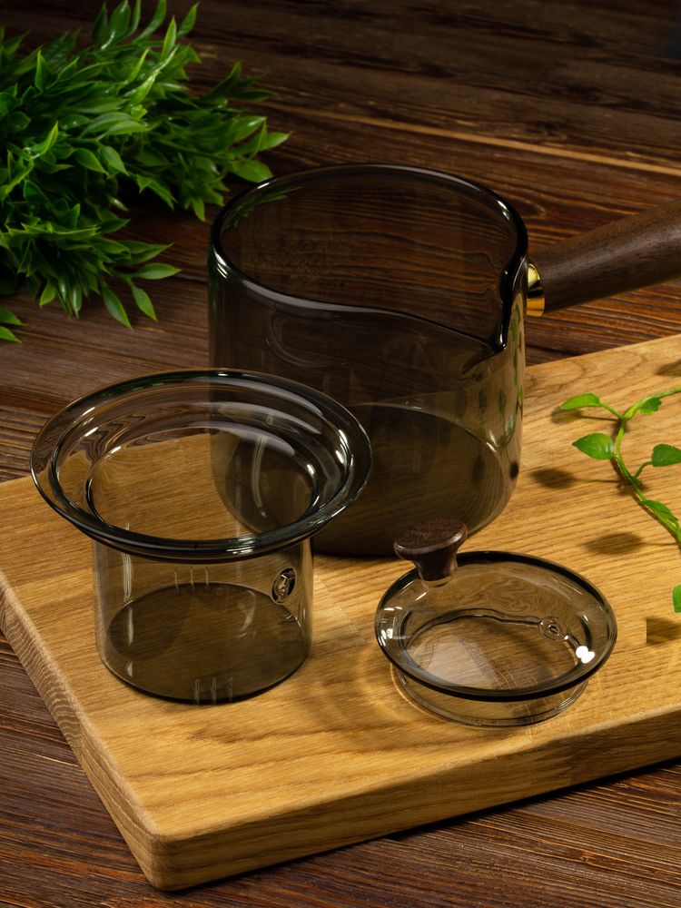 Проводник в мир спокойствия — чайник-ковш Hazy. Его мягкие линии, приглушенные цвета, стильная комбинация стекла и дерева создают атмосферу туманного утра, когда хочется укутаться в плед и насладиться чашкой горячего чая. Стеклянное сито с узкими прорезями поможет заварить чистый чай без чаинок, а эргономичная ручка — с удобством использовать чайник, не боясь обжечься.