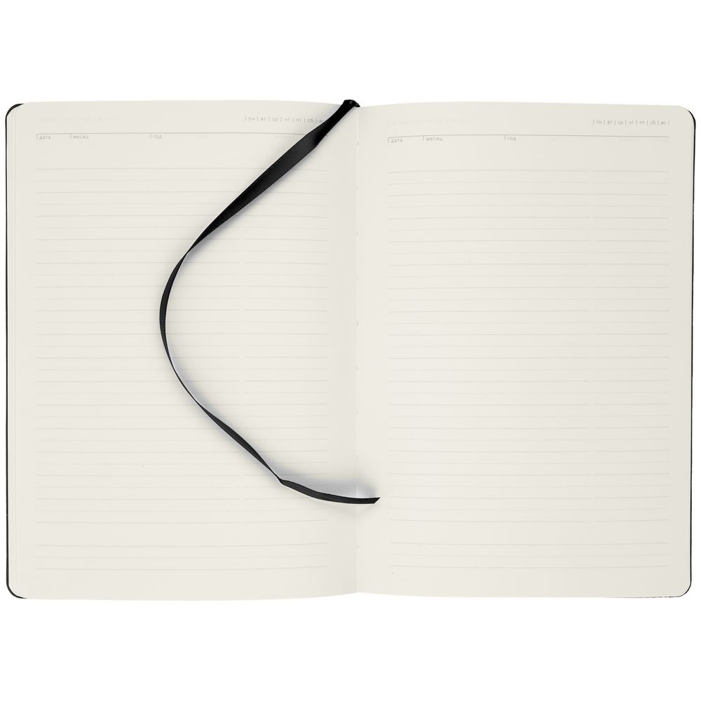 Ежедневник с гибкой обложкой, выполнен из материала Latte, черный, дополнен ляссе в цвет обложки.
