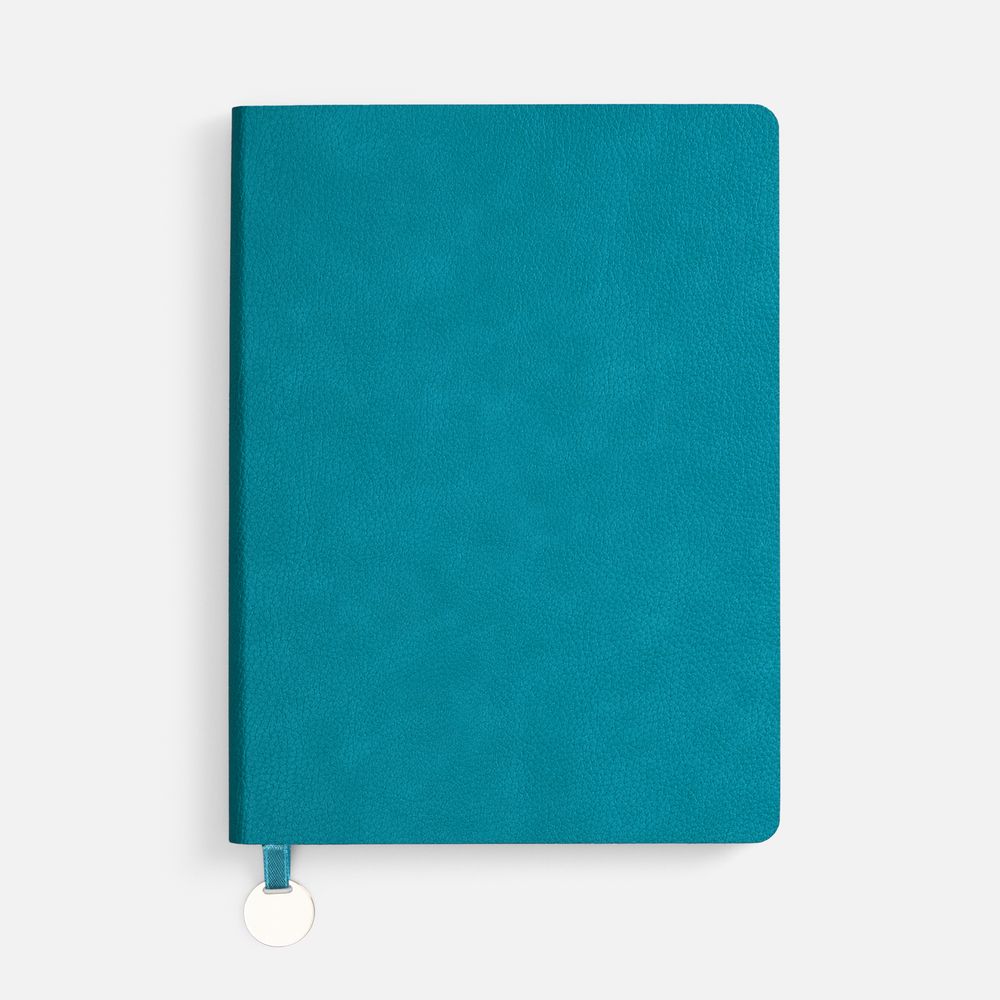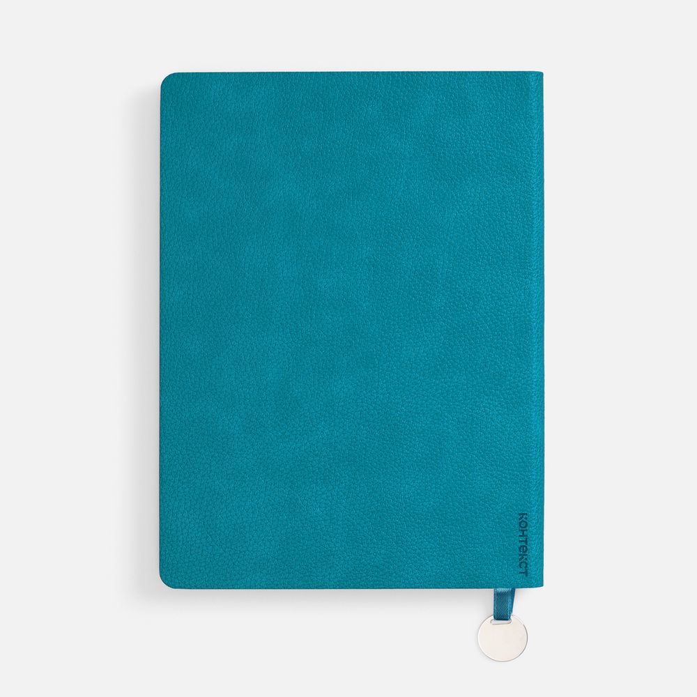 Ежедневник с гибкой обложкой, выполнен из материал La Fite, цвет морской волны II, дополнен ляссе в цвет обложки с металлическим шильдом.