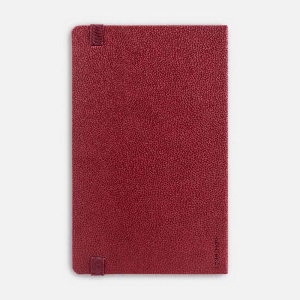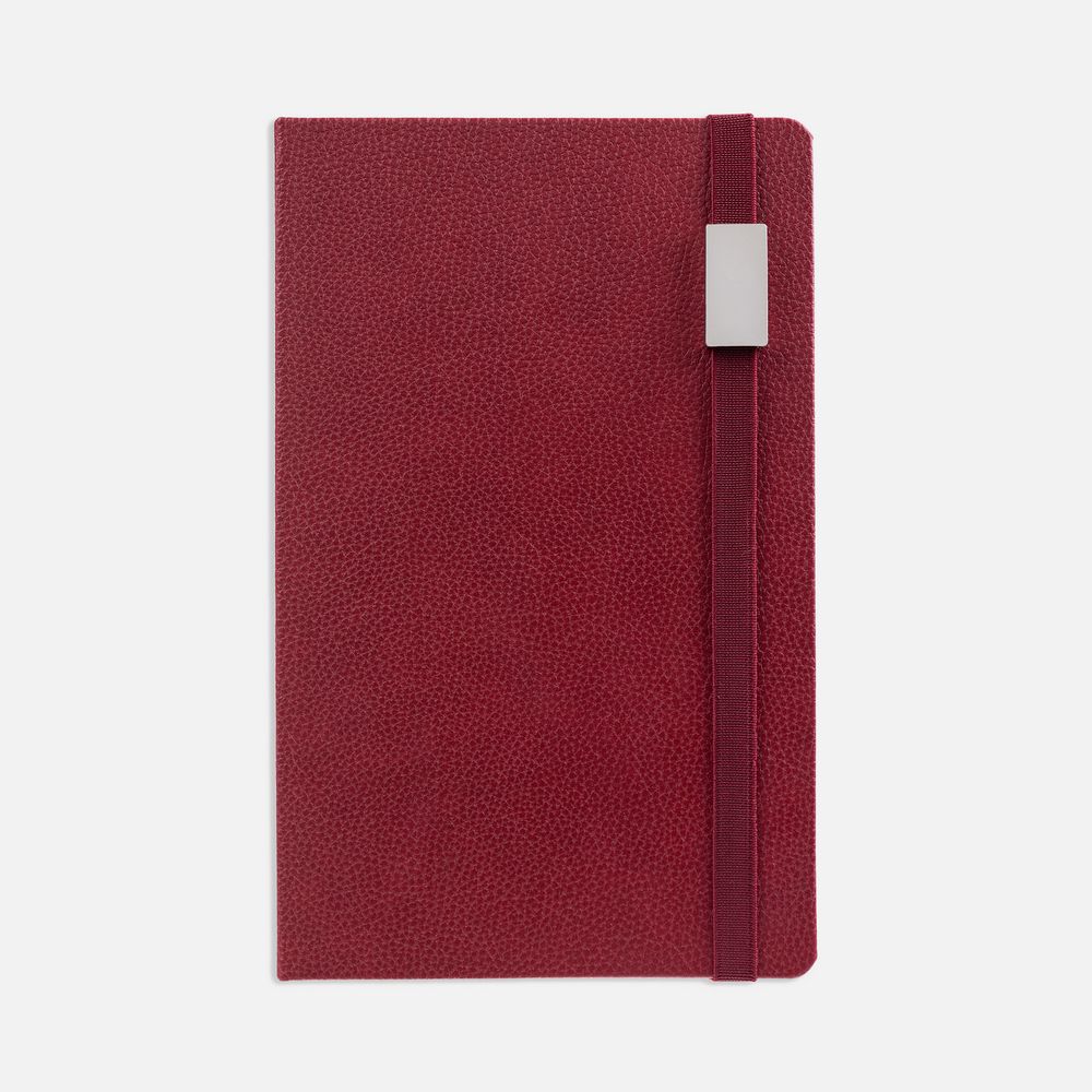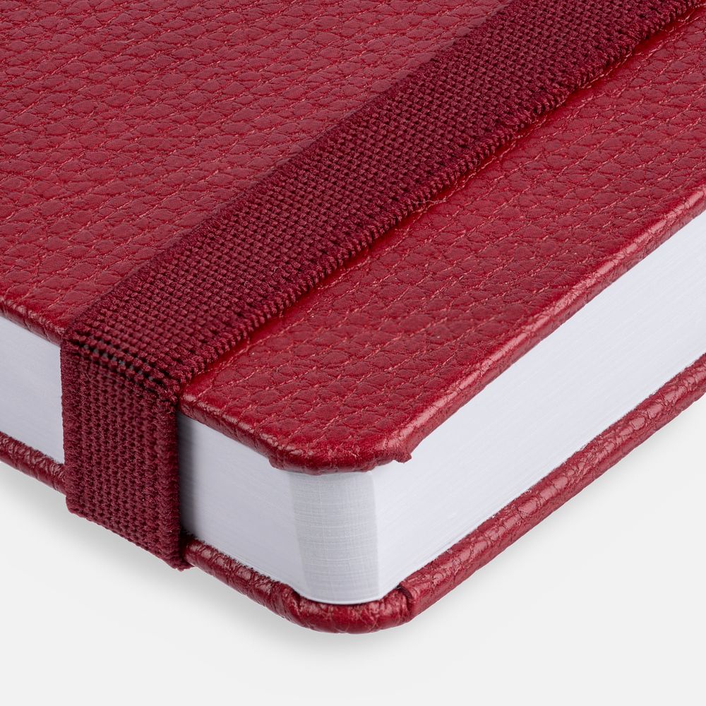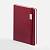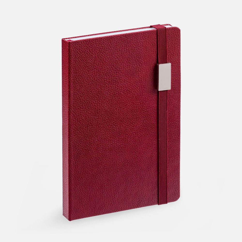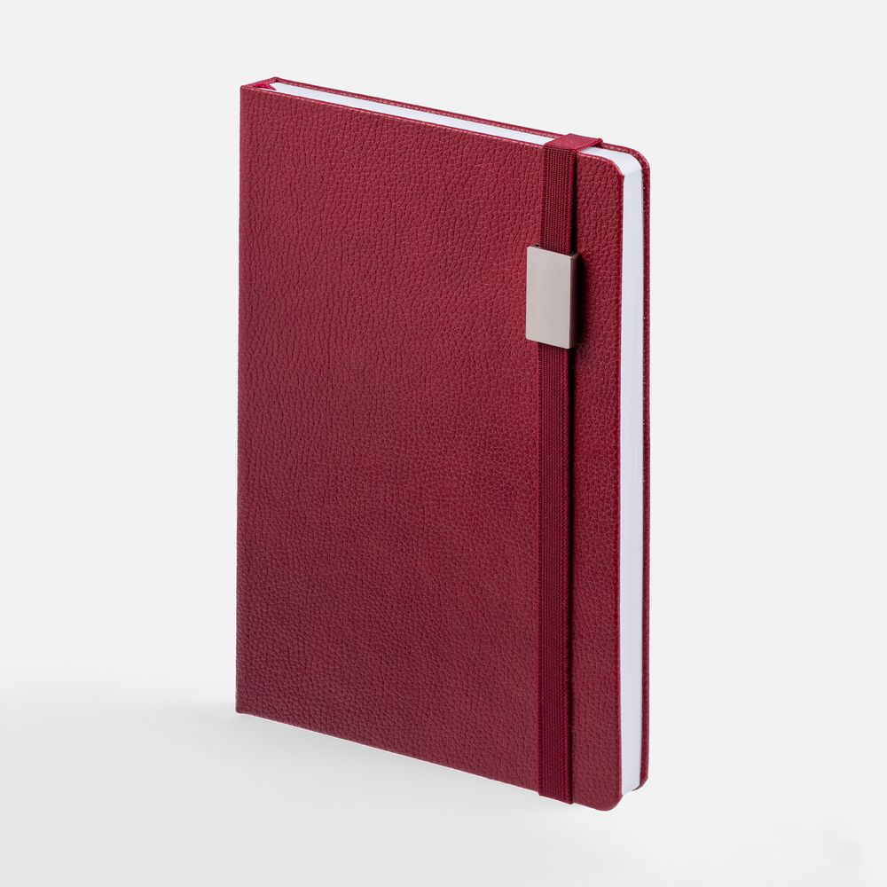 Ежедневник с твердой обложкой, выполнен из материала LaFite, красный РР, дополнен резинкой с металлическим прямоугольным шильдом и ляссе в цвет обложки.