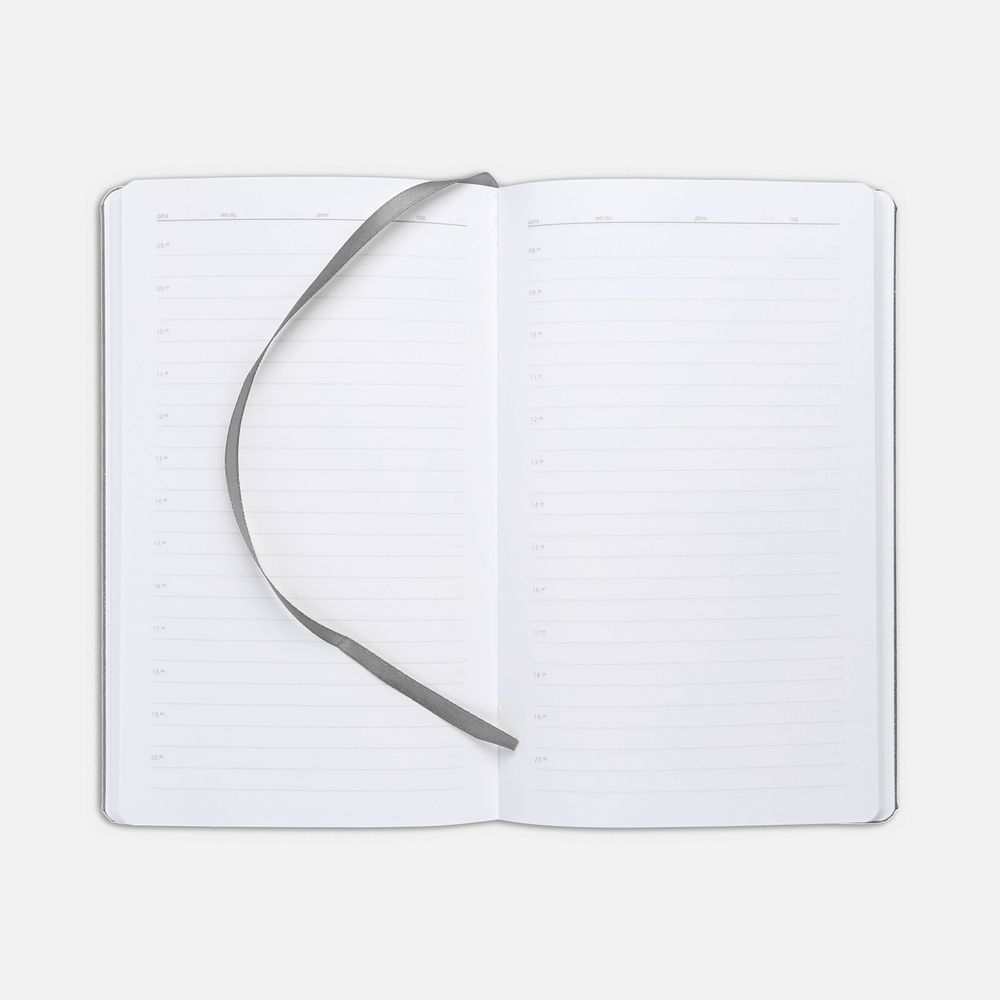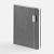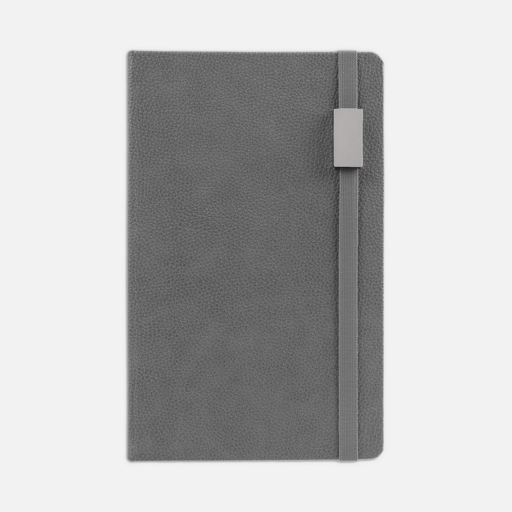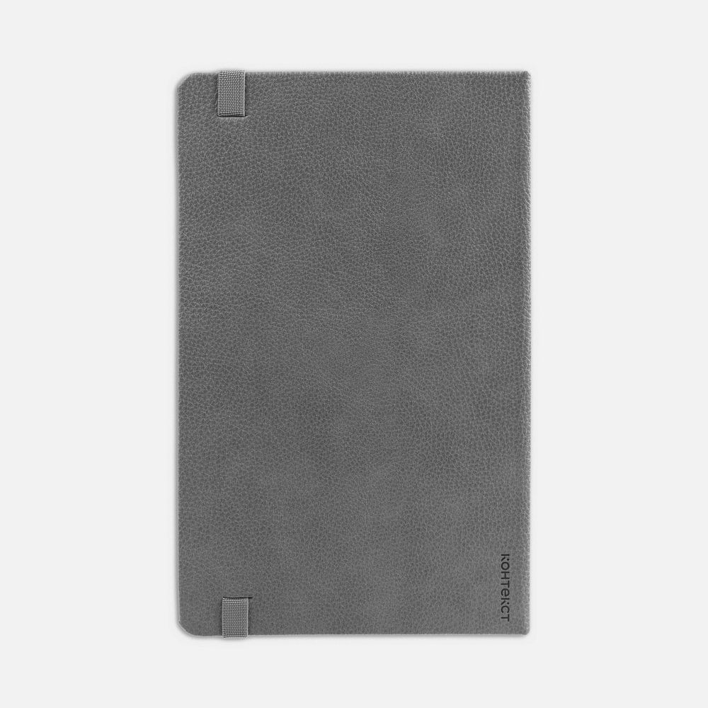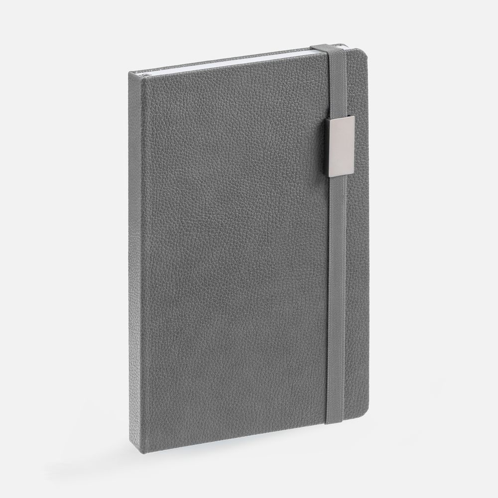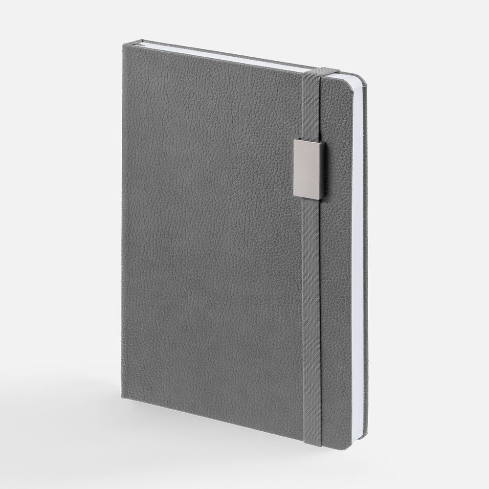Ежедневник с твердой обложкой, выполнен из материала LaFite, серый СС, дополнен резинкой с металлическим прямоугольным шильдом и ляссе в цвет обложки.