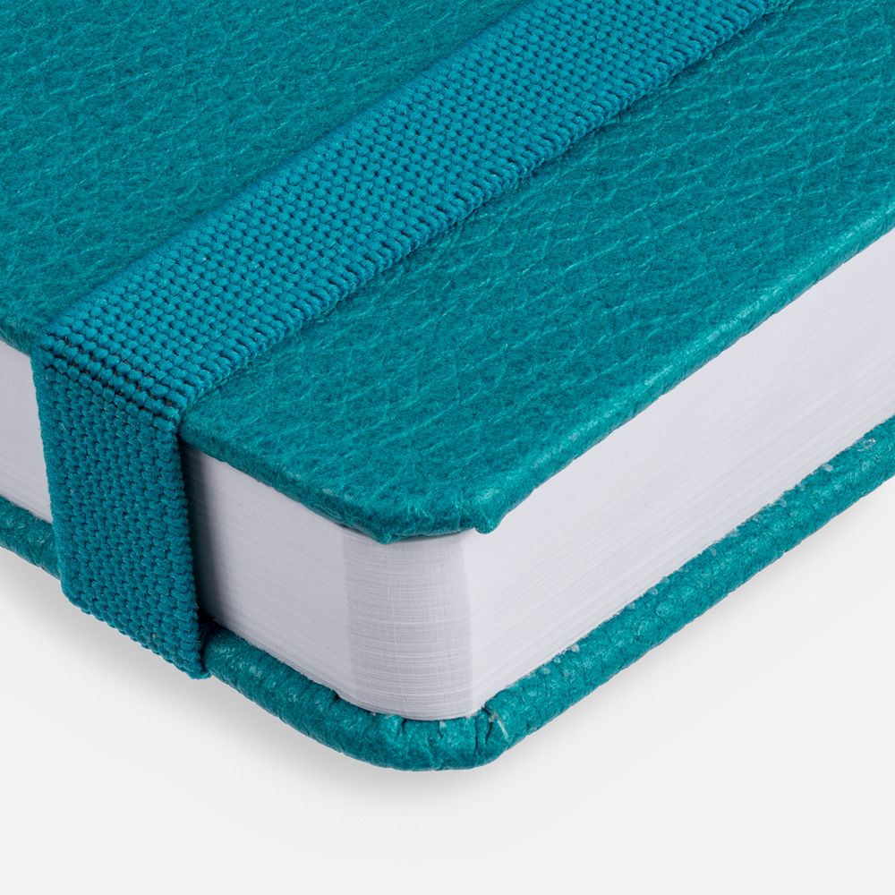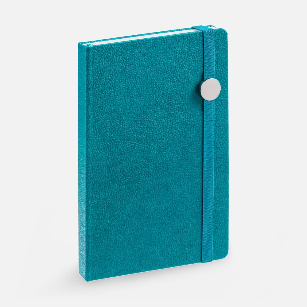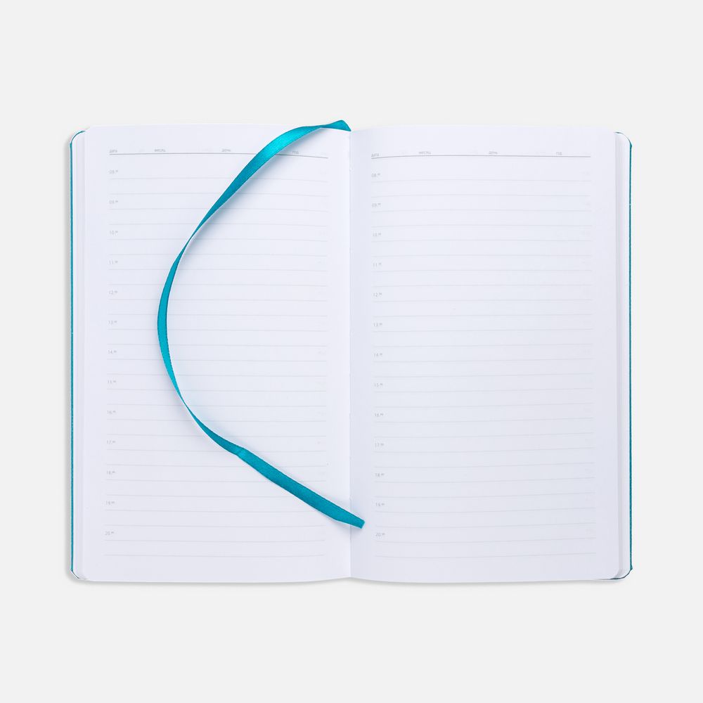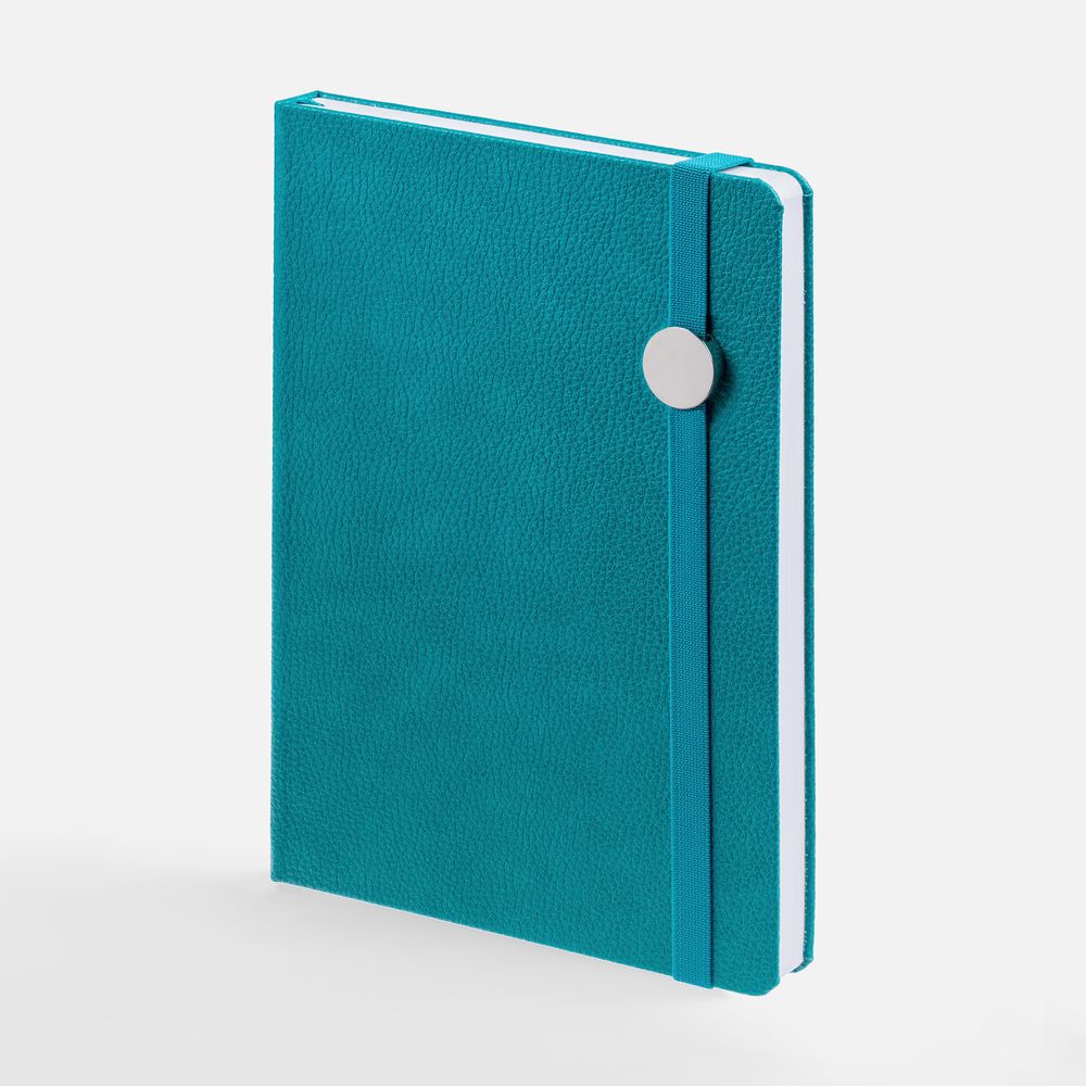 Ежедневник с твердой обложкой, выполнен из материала LaFite, цвет морской волны II, дополнен резинкой с металлическим круглым шильдом и ляссе в цвет обложки.
