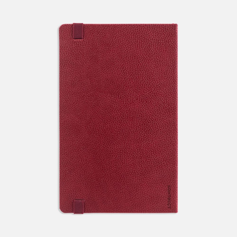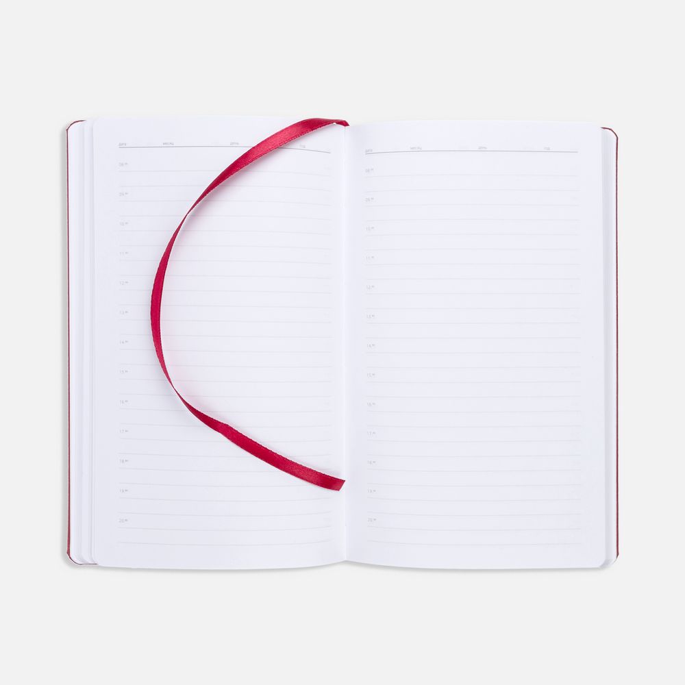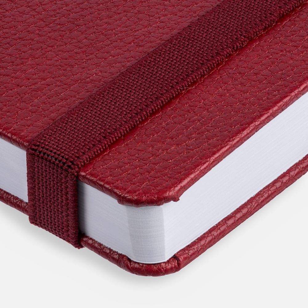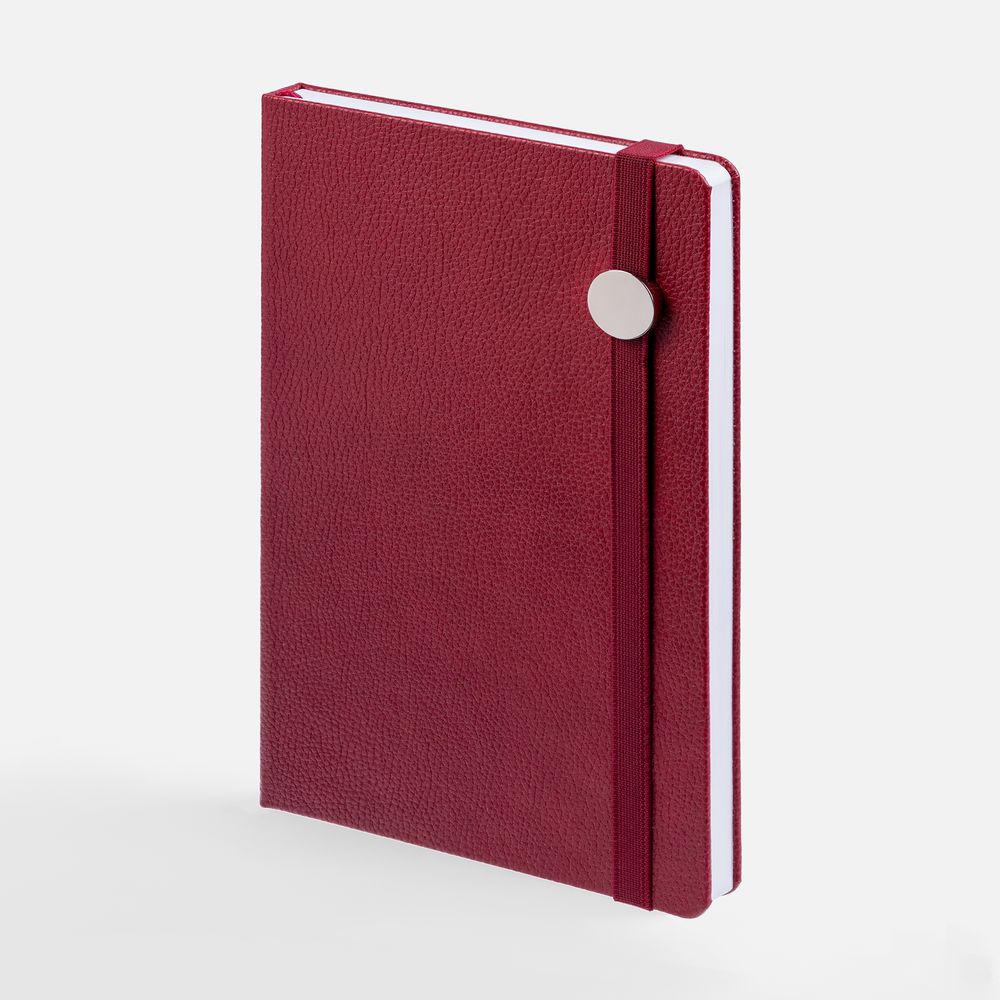 Ежедневник с твердой обложкой, выполнен из материала LaFite, красный РР, дополнен резинкой с металлическим круглым шильдом и ляссе в цвет обложки.