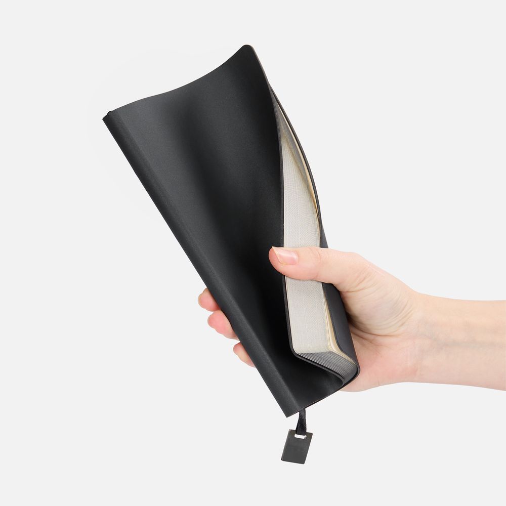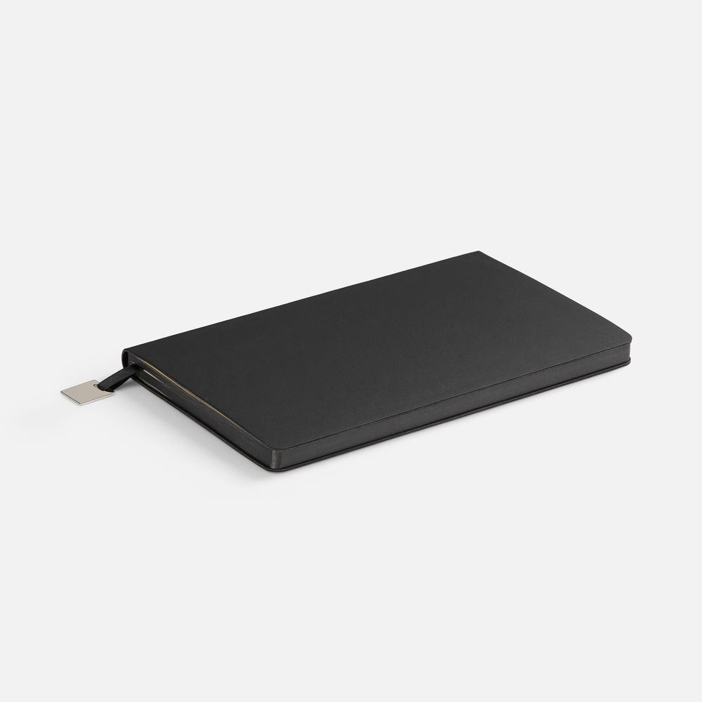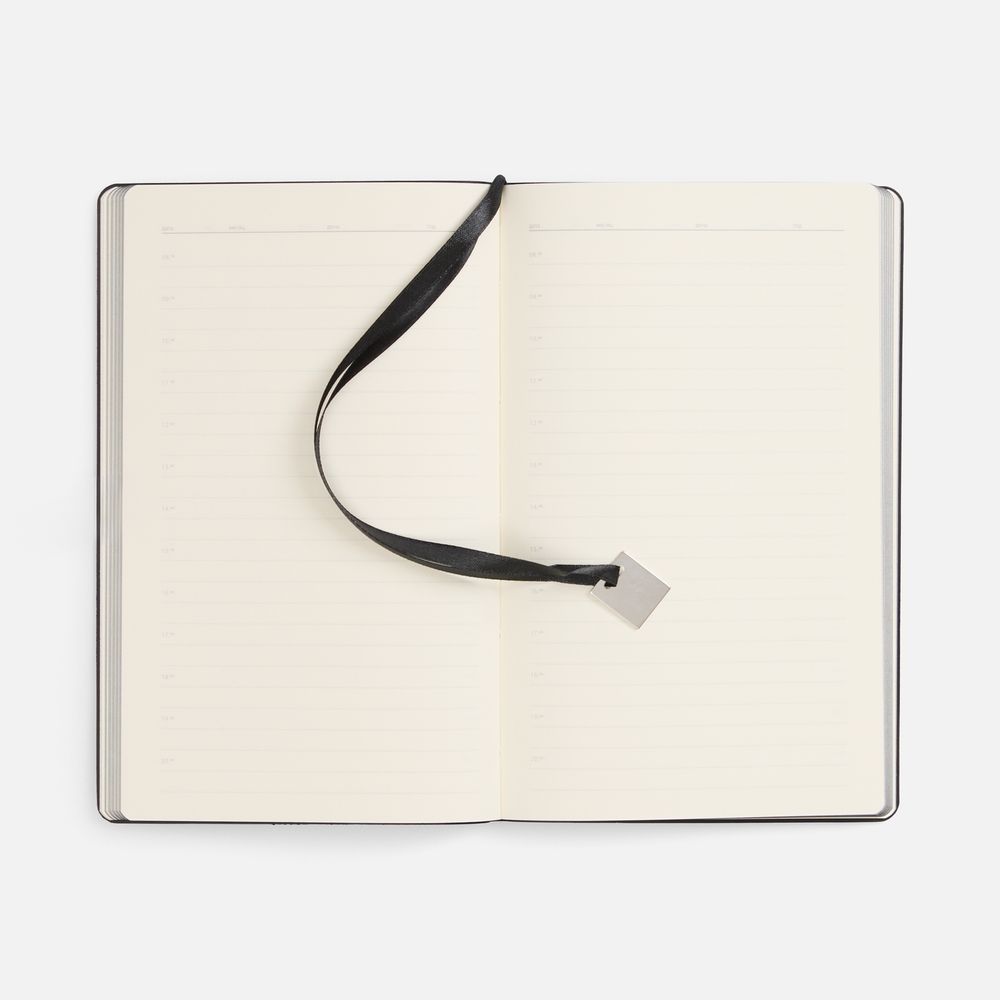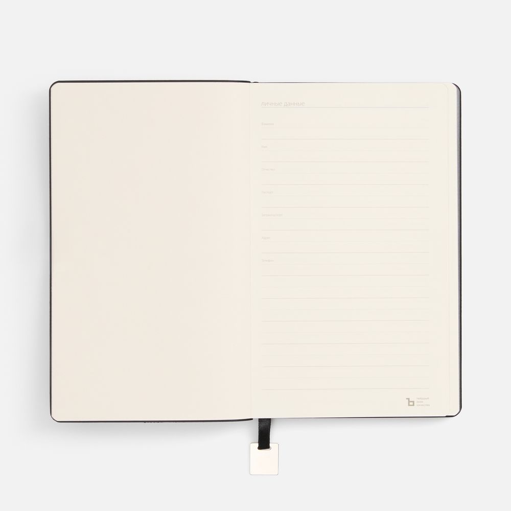 Ежедневник с гибкой обложкой, выполнен из материалов Soft Touch Pearl, черный АА, и Latte, черный (внутренняя часть обложки), дополнен ляссе в цвет обложки с металлическим шильдиком.