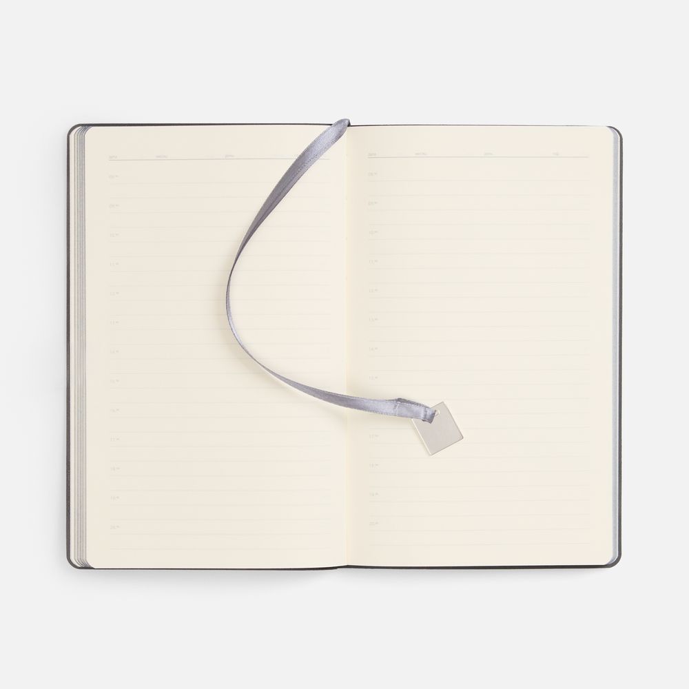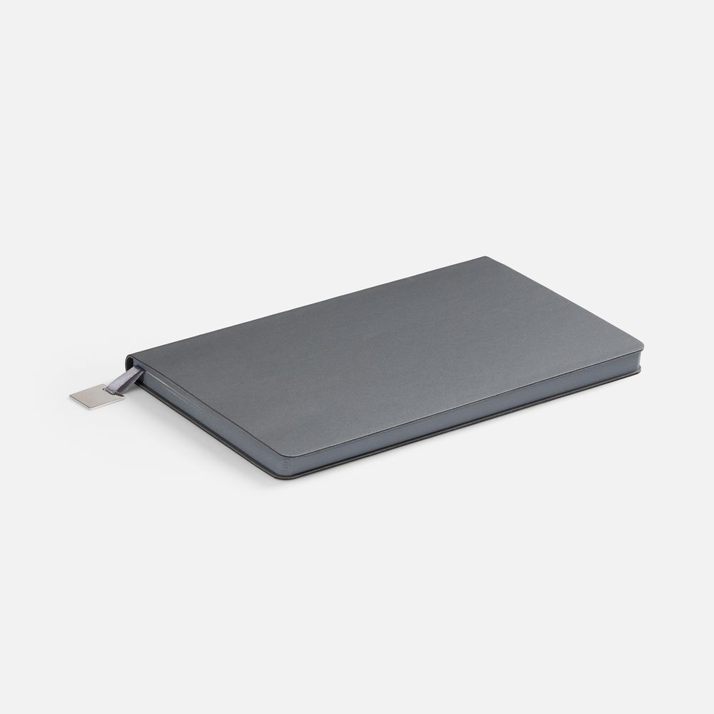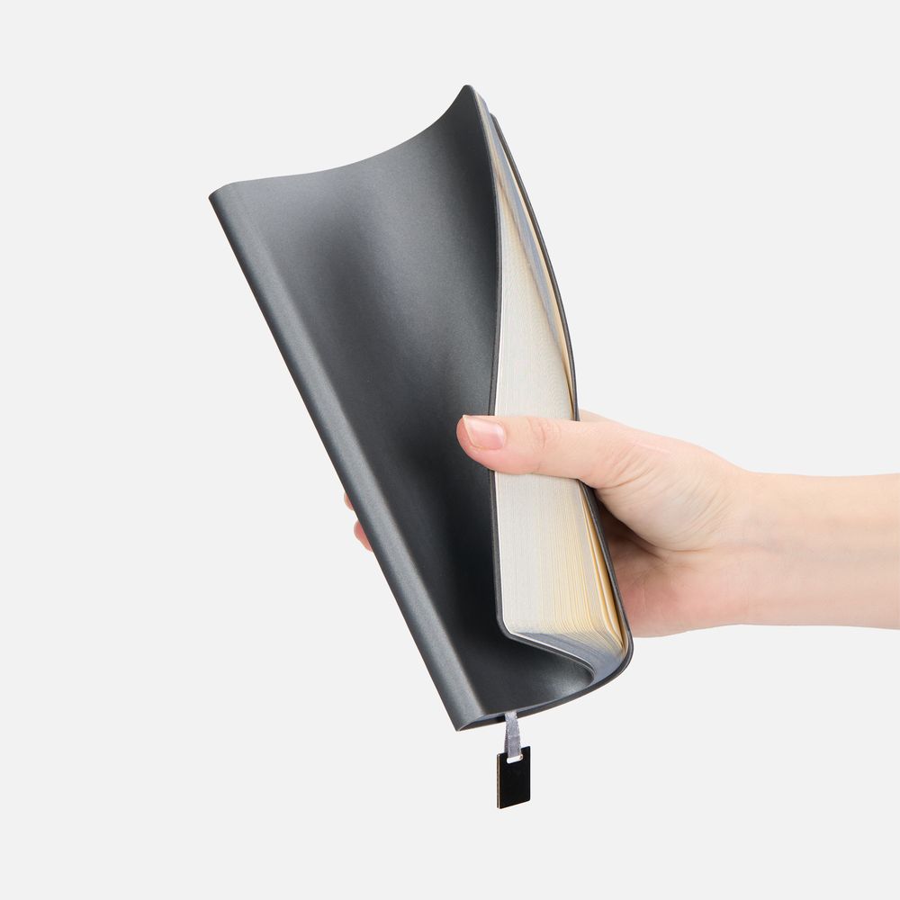 Ежедневник с гибкой обложкой, выполнен из материалов Soft Touch Pearl, серый СС, и Latte, серый (внутренняя часть обложки), дополнен ляссе в цвет обложки с металлическим шильдиком.