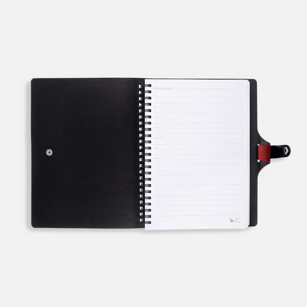 Ежедневник с гибкой обложкой, выполнен из материалов La Fite, красный РР и Waltz черный АА.
