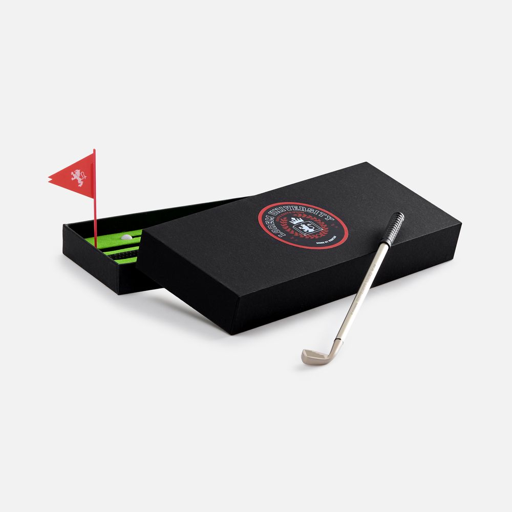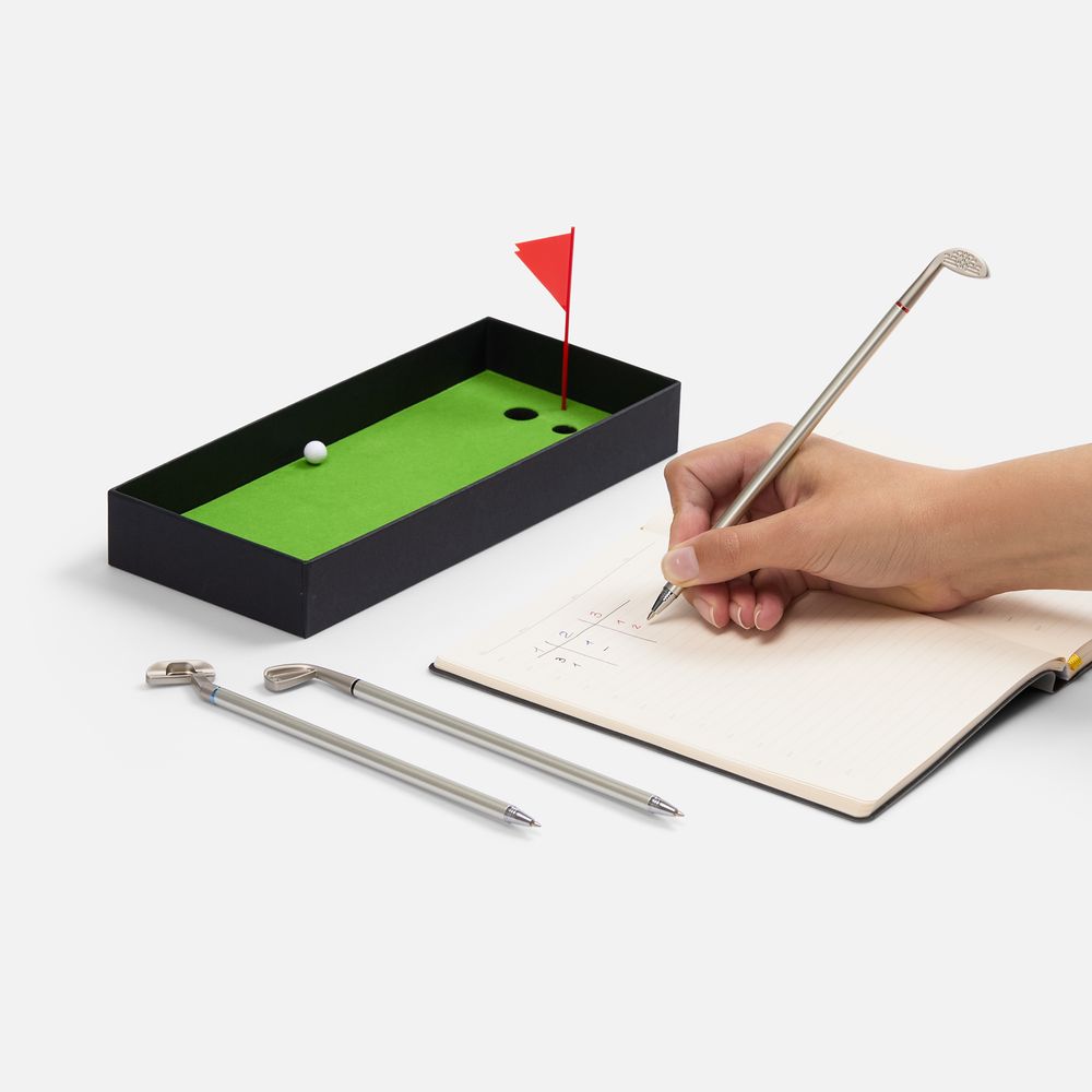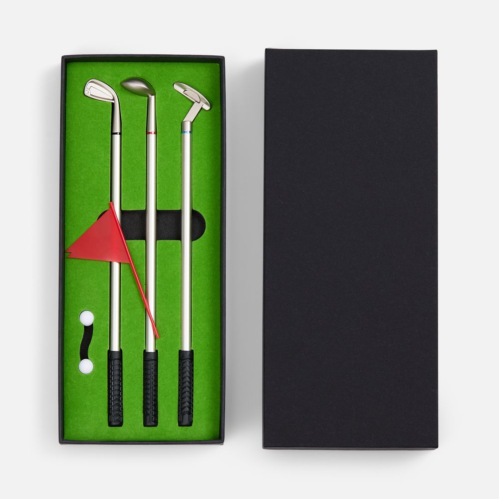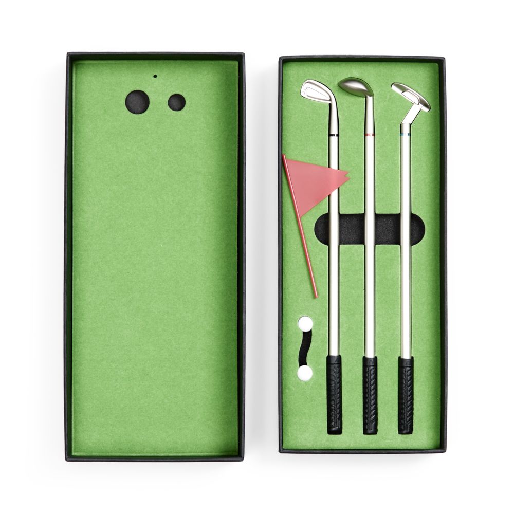 В комплекте: 3 клюшки-ручки со сменным стержнем с синими, черными и красными чернилами, 2 мячика для гольфа, флажок и подарочная коробка.| Вес и габариты | ||