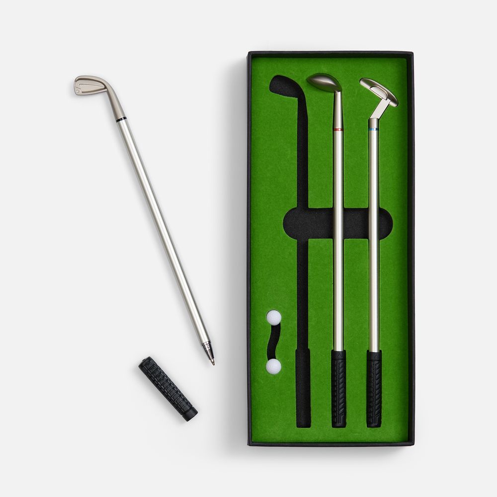 Без резиновых колпачков мини-клюшки превращаются в элегантные пишущие ручки, каждая со своим цветом чернил: черным, красным и синим.