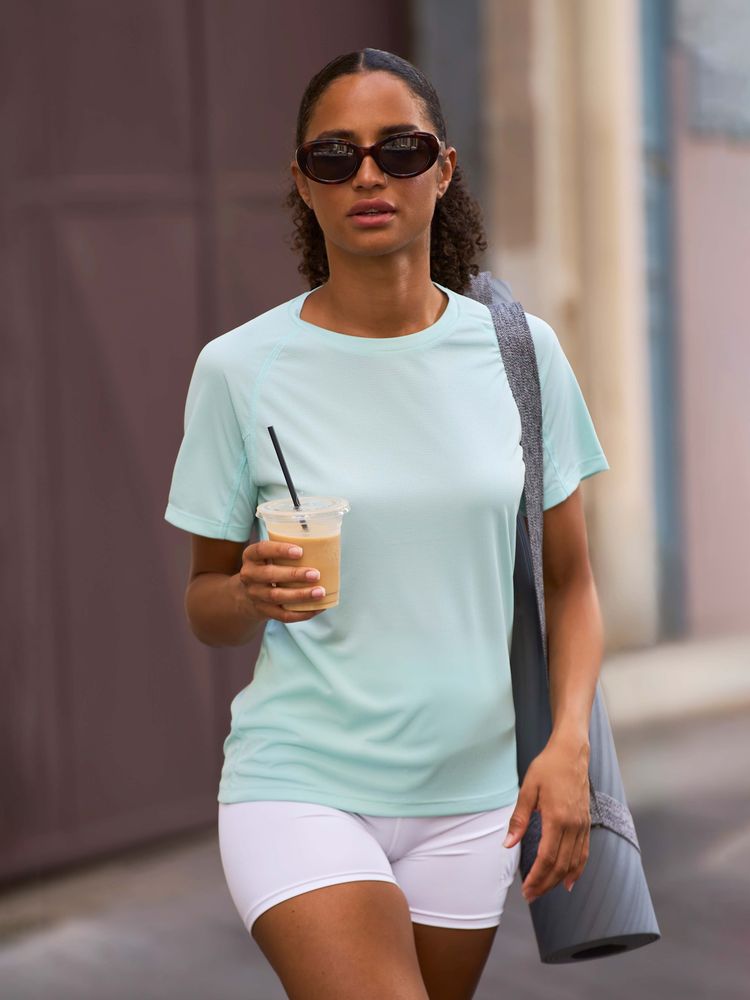 Женская спортивная футболка из дышащего и быстросохнущего материала. Приятная на ощупь и легкая ткань не стесняет движений.