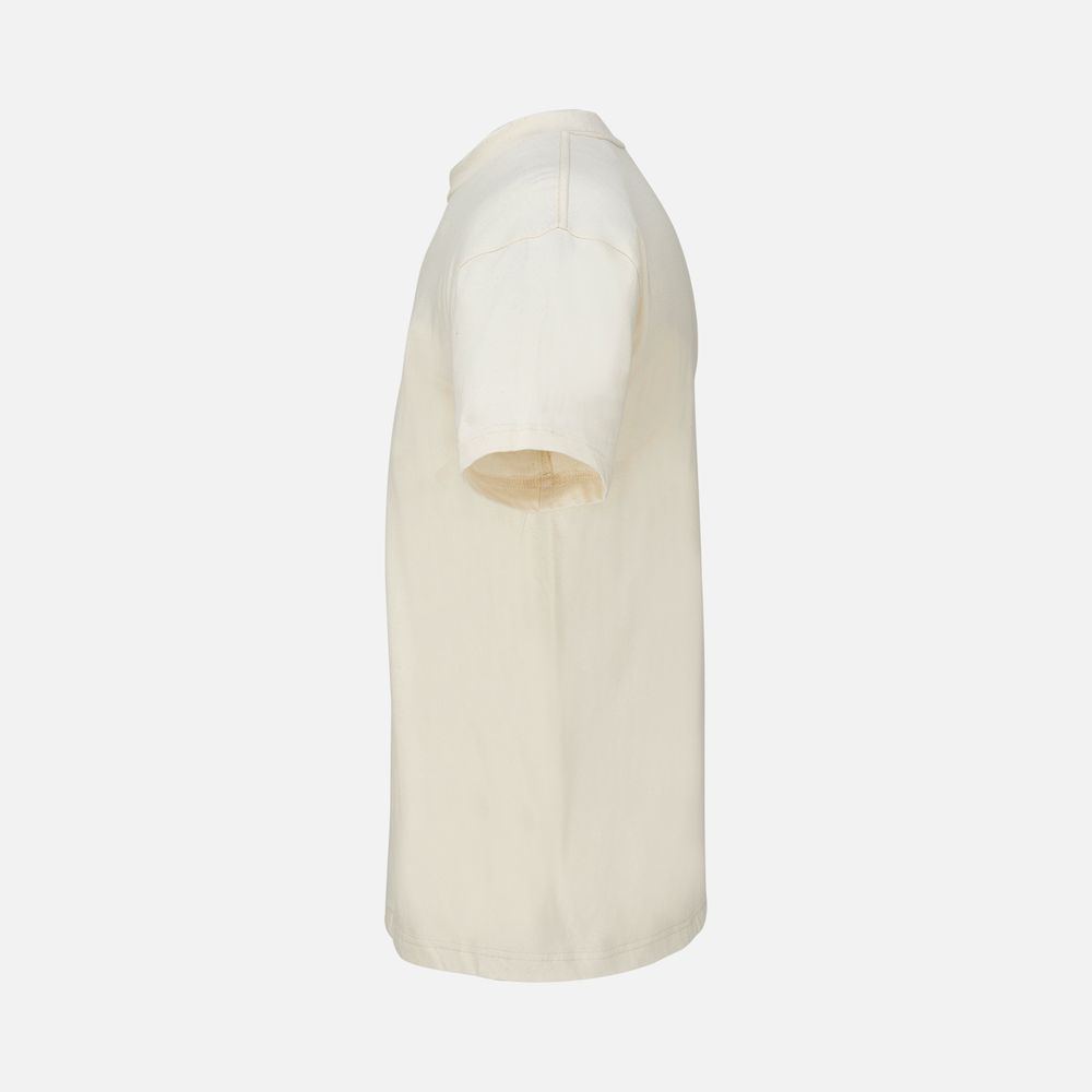 Ткань хорошо держит форму и не просвечивает, при этом футболка остается мягкой и приятной к телу. Особенности обработки волокна и конструкция с заметной высокой горловиной создает аутентичный образ с винтажной фактурой.