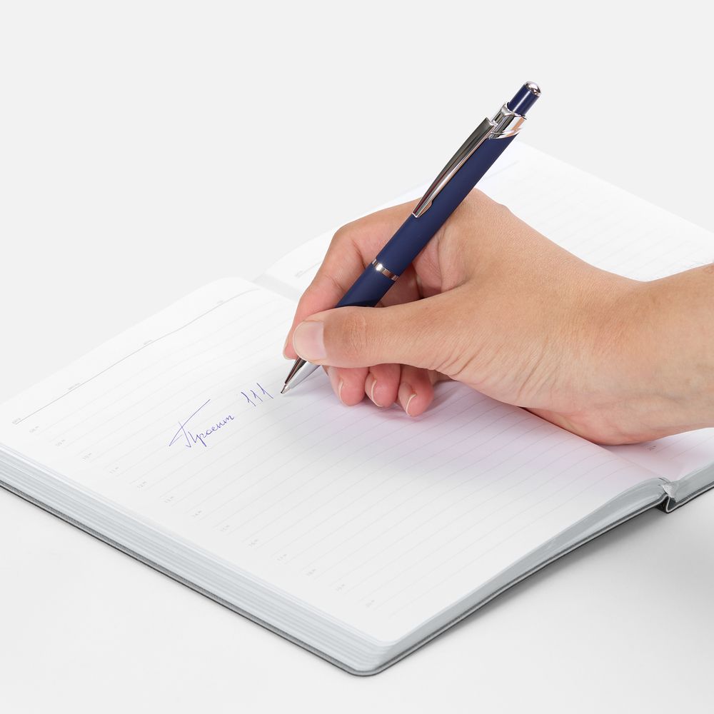 Металлическая ручка с покрытием софт-тач и серебристыми деталями.
