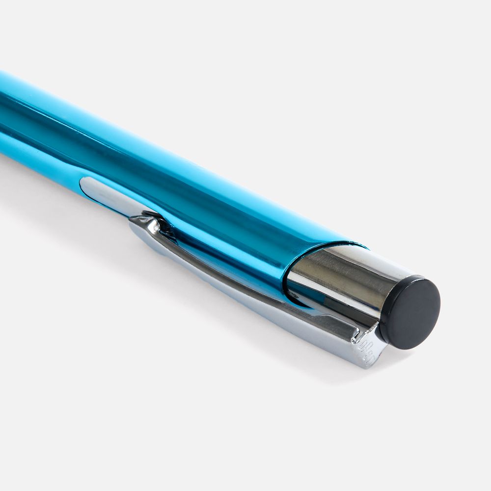 Яркая шариковая ручка с глянцевым цветным корпусом и хромированными деталями.