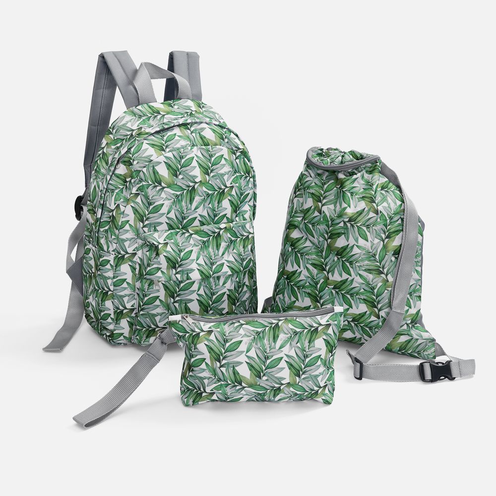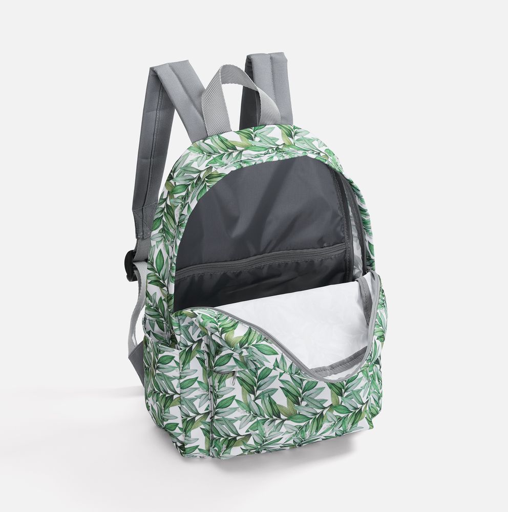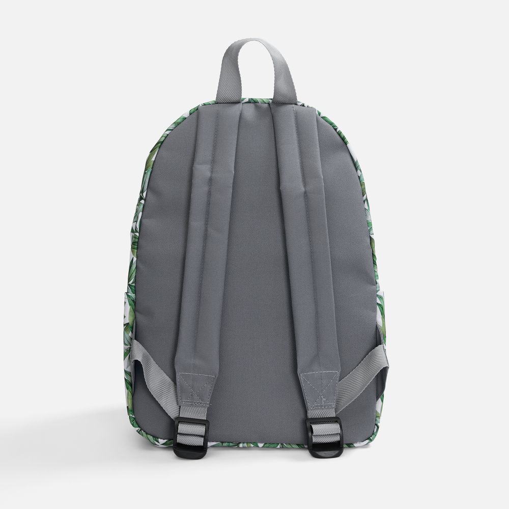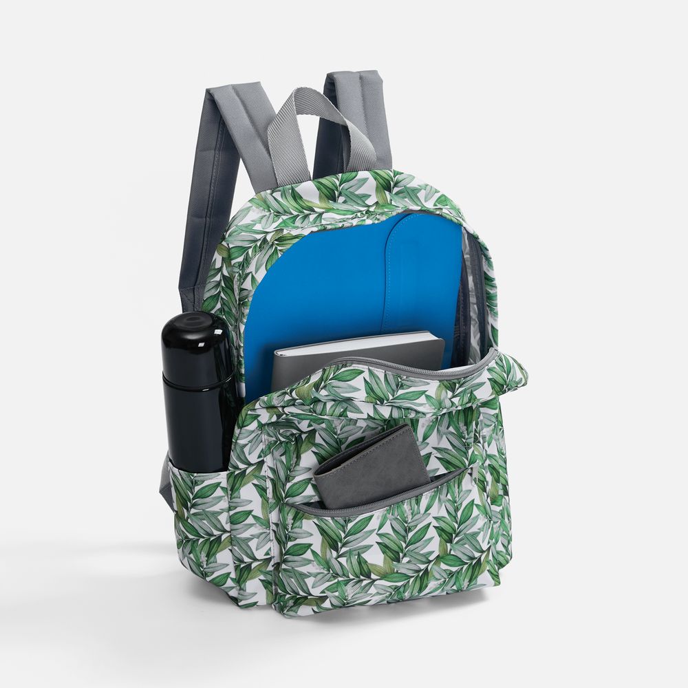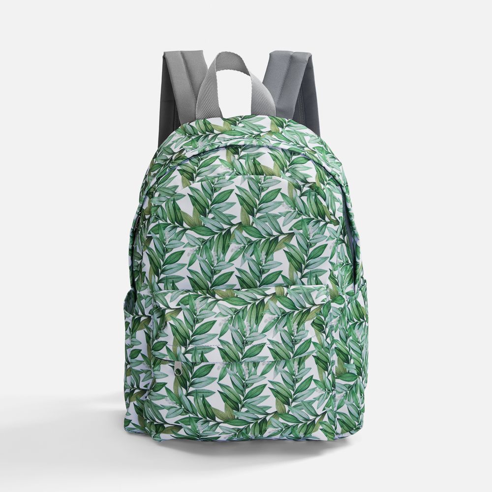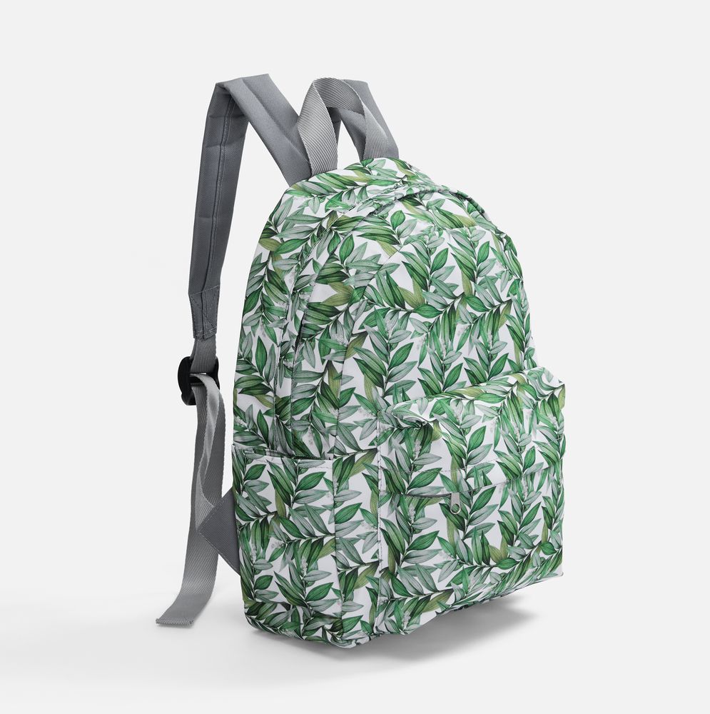 В стоимость входят запечатка полотна бесшовным паттерном методом сублимации для основной части рюкзака, раскрой и пошив изделия. Задняя панель, молния и лямки — серого цвета.