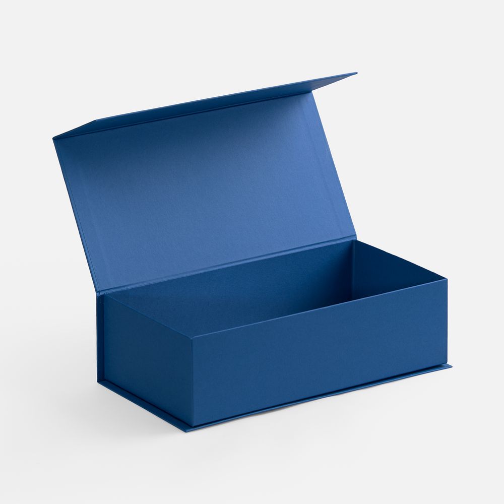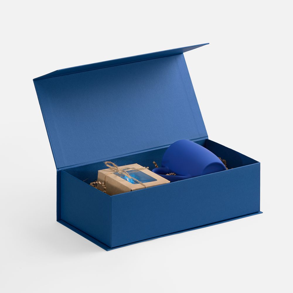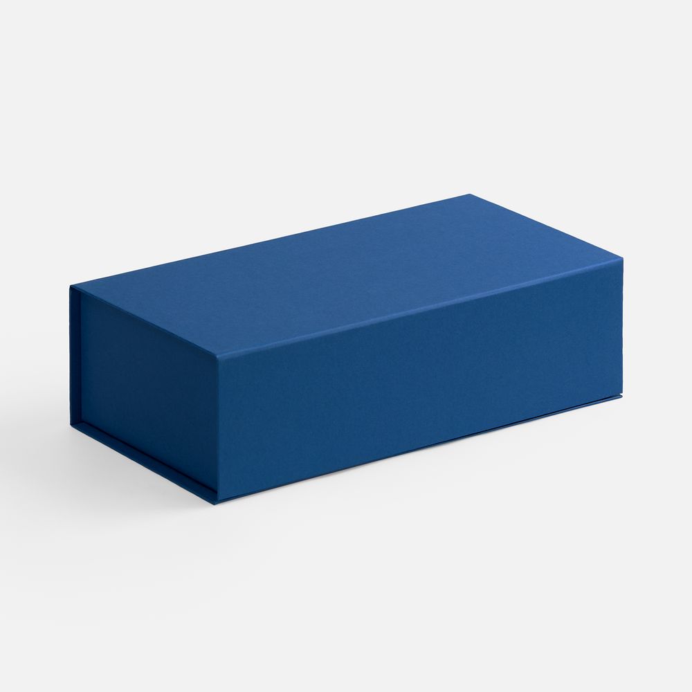 Коробка изготовлена из переплетного картона, кашированного гладкой дизайнерской бумагой Malmero, с крышкой на магните.