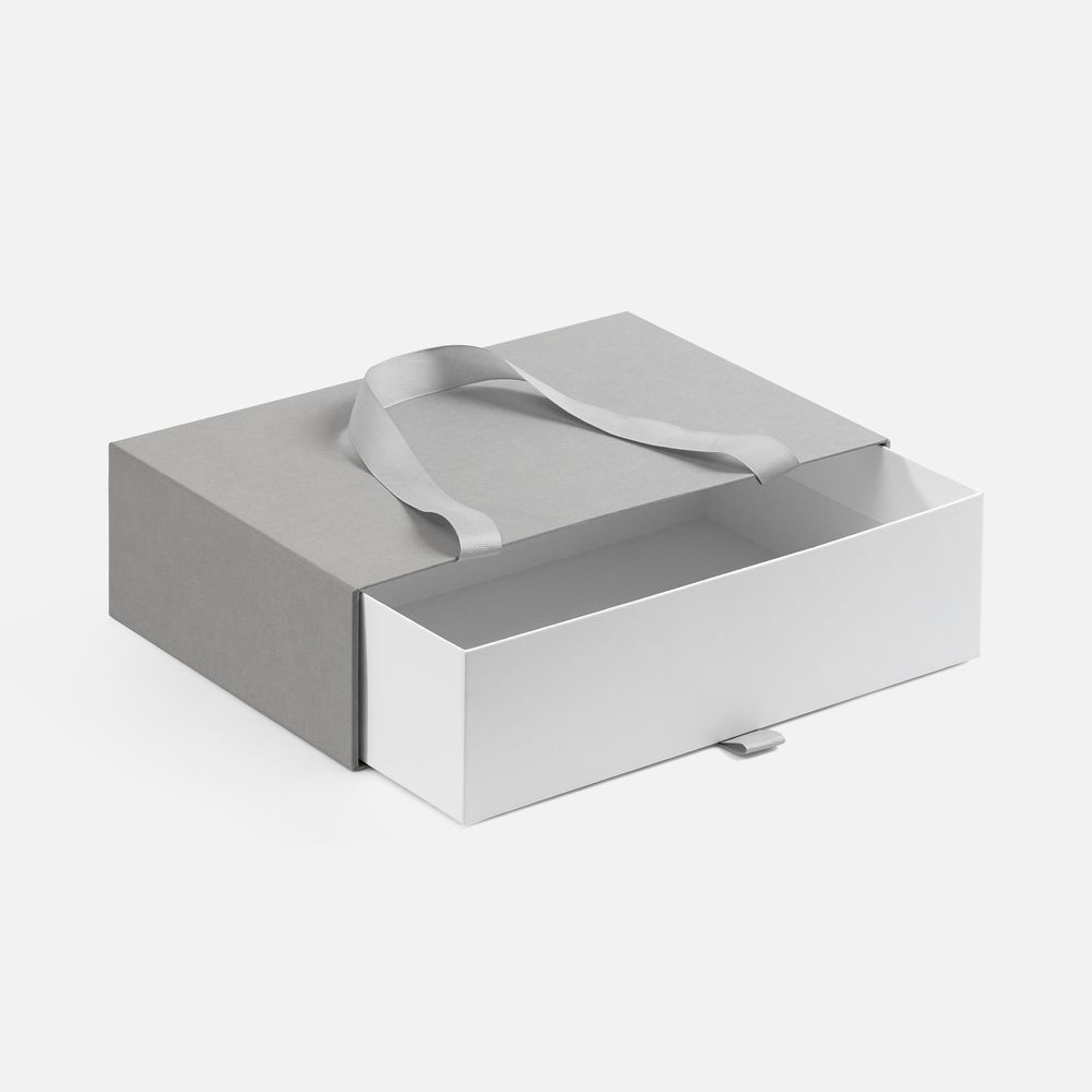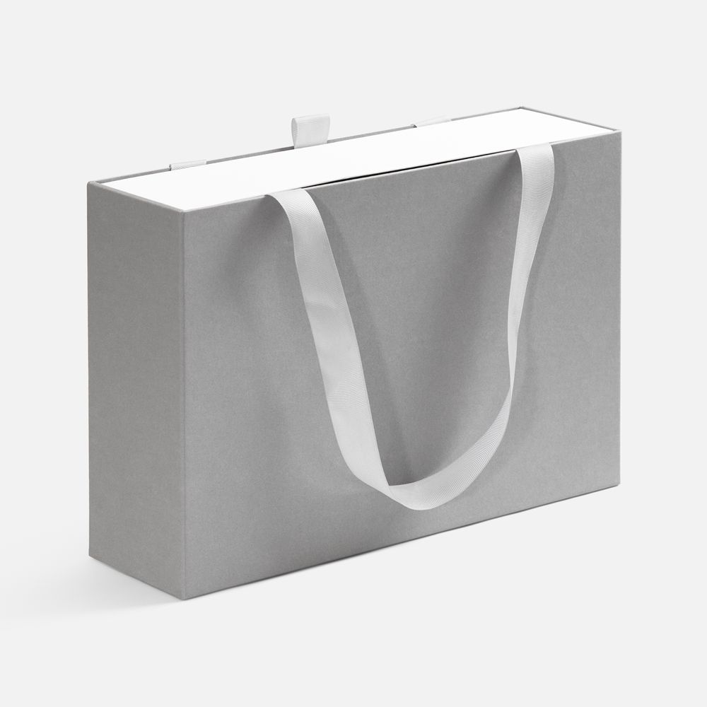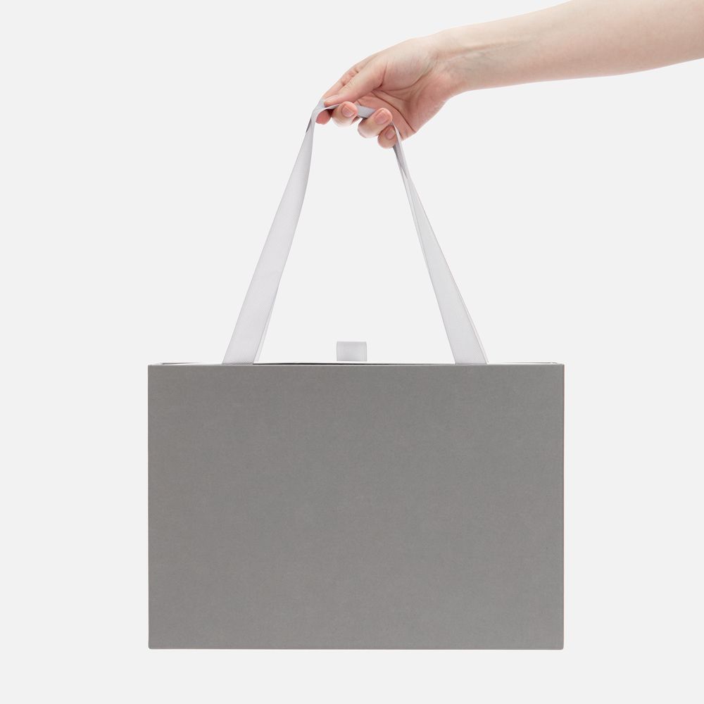 Внешний короб каширован дизайнерской бумаги и оснащен прочными ручками из репсовой ленты. Внутренний короб отделан белой бумагой, ламинированной матовой пленкой.