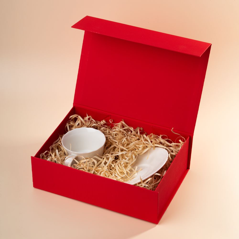 Коробка из переплетного картона, кашированного тисненой тонированной в массе бумагой, с крышкой на магните.