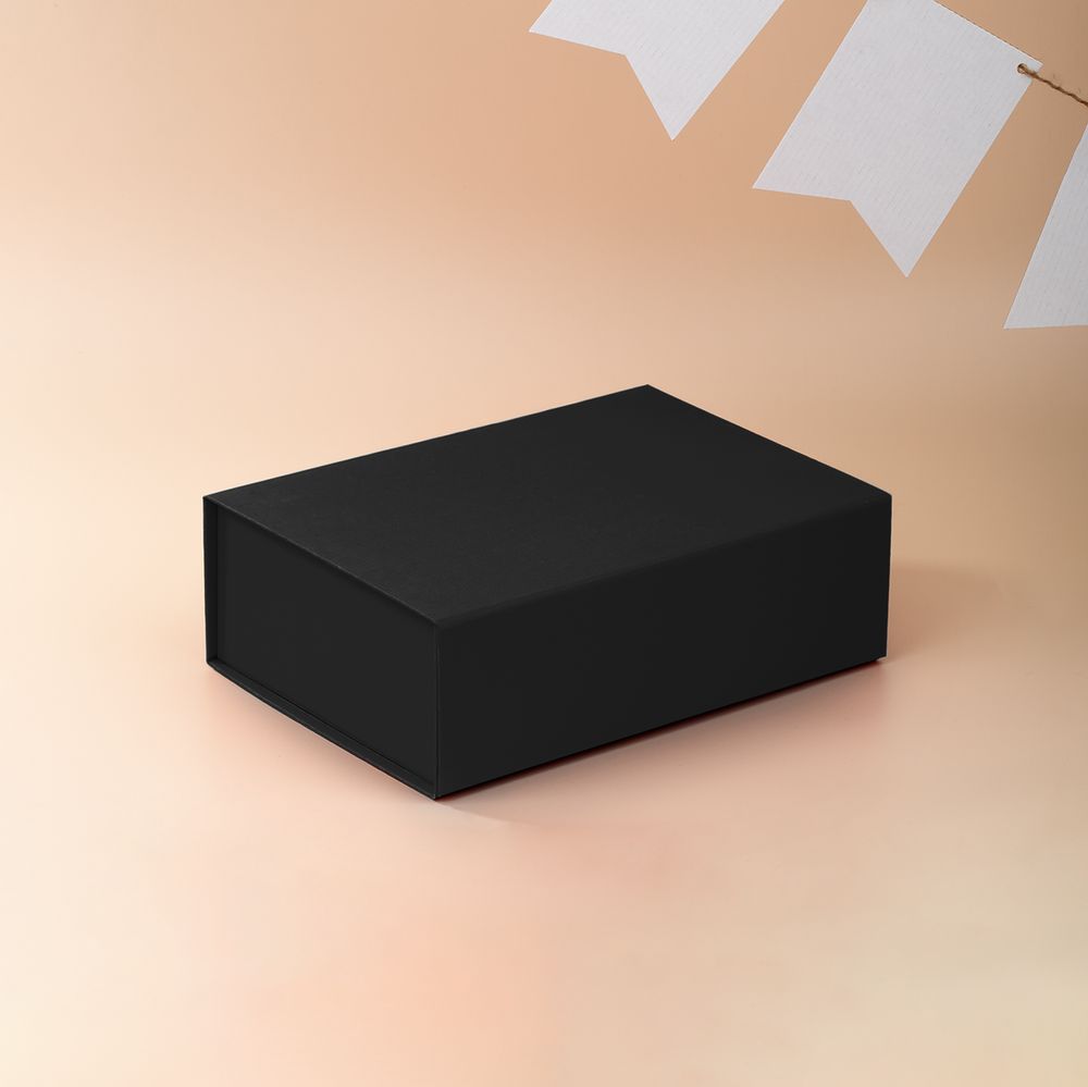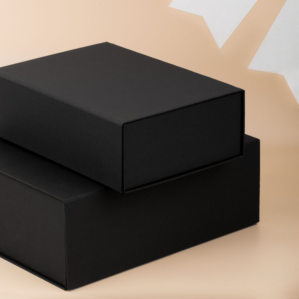 Коробка из переплетного картона, кашированного тисненой тонированной в массе бумагой, с крышкой на магните.